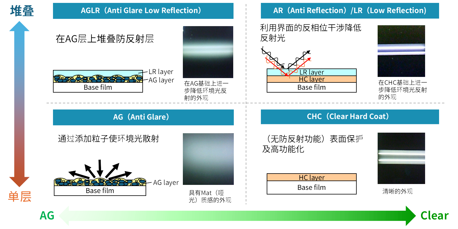 - 产品系列涵盖Clear(透明)和AG(防眩)两类,以及包括在此基础上堆叠了防反射层的产品在内的共4种类型