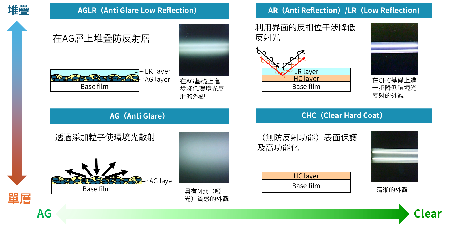 - 產品系列涵蓋Clear(透明)和AG(防眩)兩類,以及包括在此基礎上堆疊了防反射層的產品在內的共4種類型