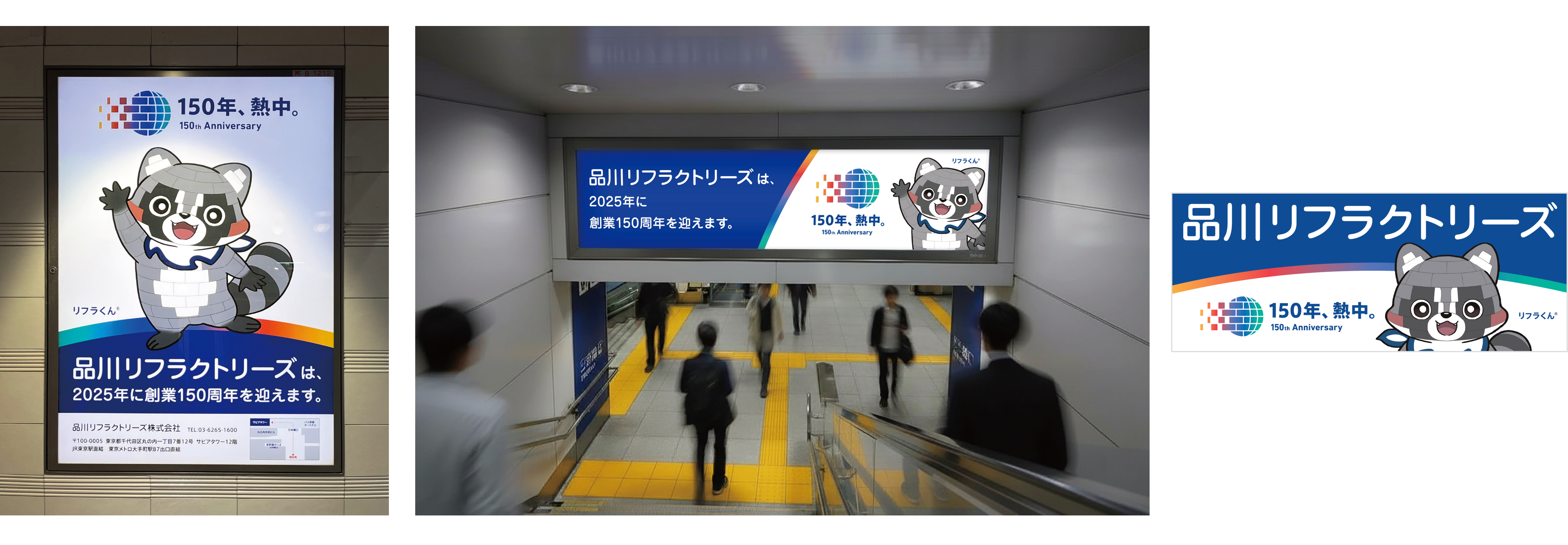 開発した周年スローガンと周年ロゴは、コーポレートキャラクター“リフラくん®”をベースに、東京駅の八重洲口や新幹線16番、17番ホームの階段、さらに東京ドーム(レフト側)、岡山駅構内などに広告を展開し、150周年を迎える企業としての周知を行いました。