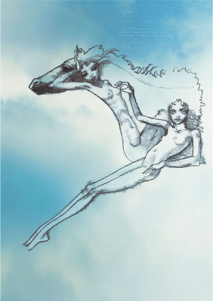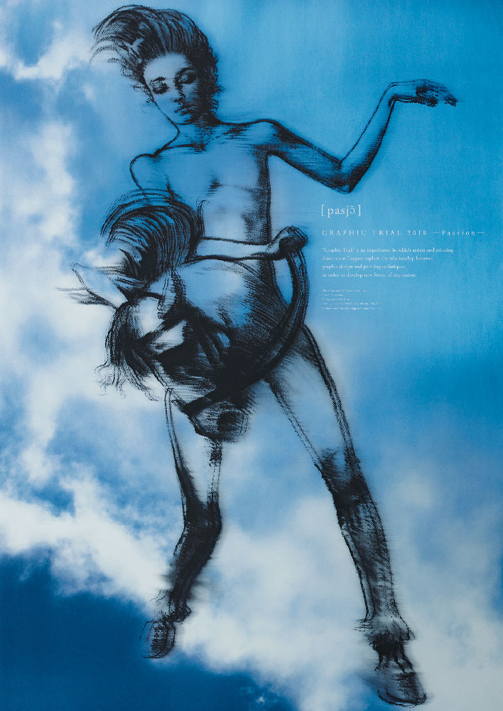 木炭ドローイングに空の写真を融合し、印刷技術が絡み合う。時と空間が折り重なり、共鳴し合うなかで出現した、フォトジェニックでダイナミックな表現世界。