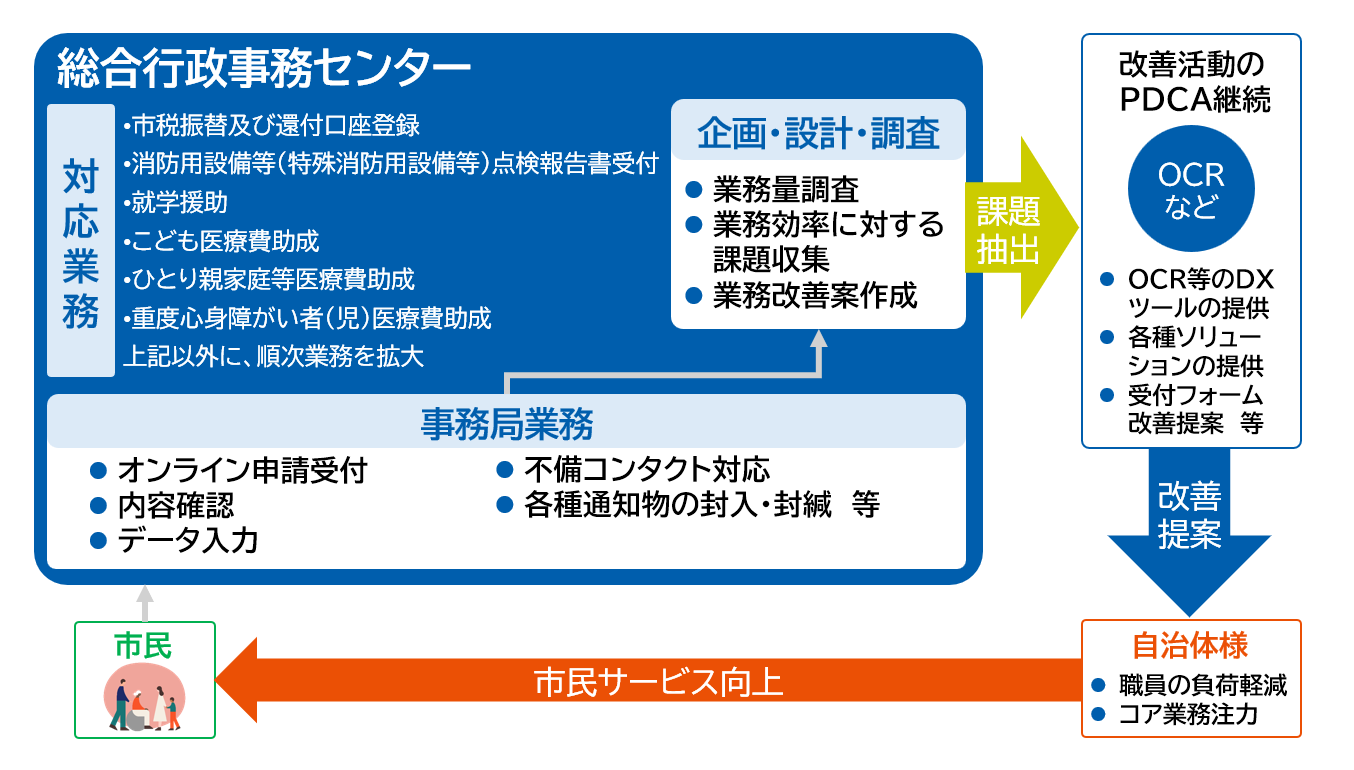 こうしたなかで、定型業務や窓口対応に追われることによる職員の負担増、時間外勤務の常態化、業務改善の停滞といった課題が顕在化していました。区ごとに異なる手法で類似業務を処理していたため、業務標準化が進まず、効率性の低下や遅延リスクの増大も見られるなど、市民サービスの向上と職員の生産性向上を両立するには、事務業務の集約と効率化が不可欠な状況となっていました。