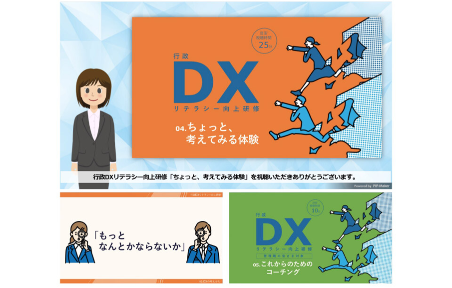 この研修は、特定の部署だけでなく、全職員一人ひとりが行政DXを「自分ごと」として捉え、当事者意識を持つことを目的としました。 また、研修動画の配信手段として、ビジネス動画セルフサービス「PIP-Maker®︎」を導入。勤務形態が多様な職員でも都合の良い時間に視聴でき、クイズ機能などで視聴効果を高める工夫を施しました。