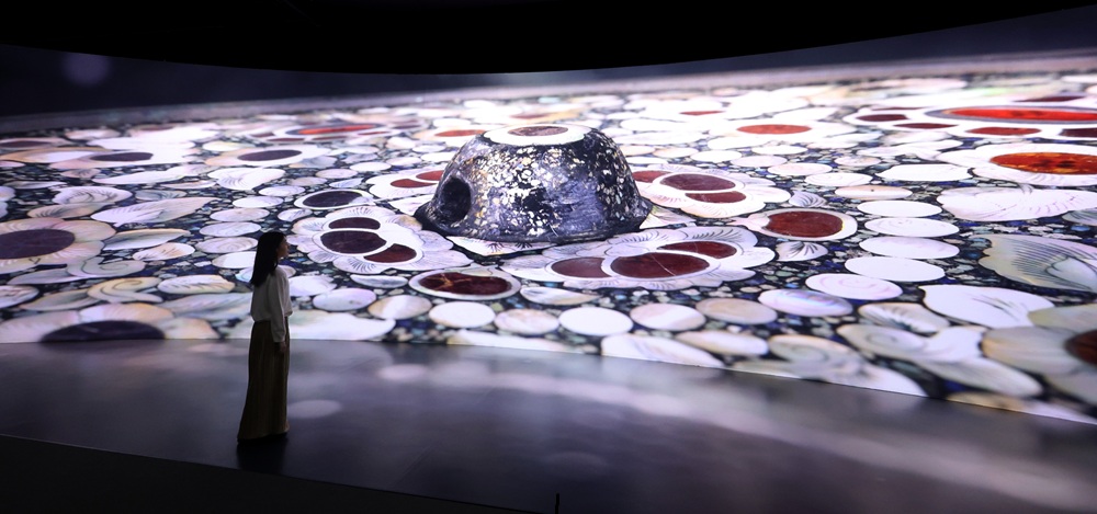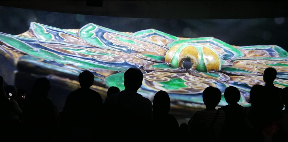 最も大きな展示室で目に飛び込んで来るのは、高さ約4メートル、幅約20メートルの巨大なスクリーンです。そこに映し出される巨大な宝物の美しさに、人々は思わず息をのみます。