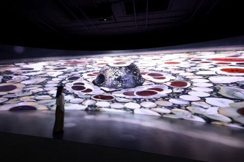 この超高精細映像を映し出すために、2023年のノーベル賞技術で最新の「量子ドット」を応用し開発された特殊塗料のスクリーンを国内展覧会で初めて採用。