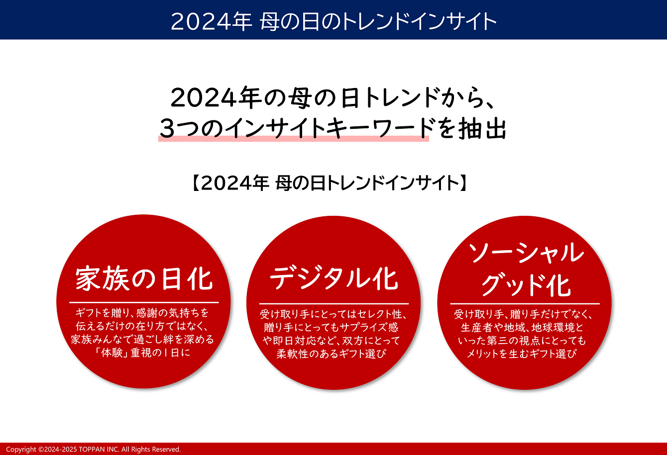 TOPPANでは、母の日や、バレンタイン、クリスマスなどの年間催事における世の中の潮流や生活者実態に着目したレポートを制作・発刊しています。