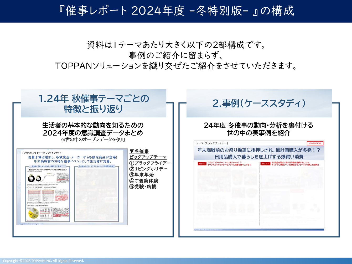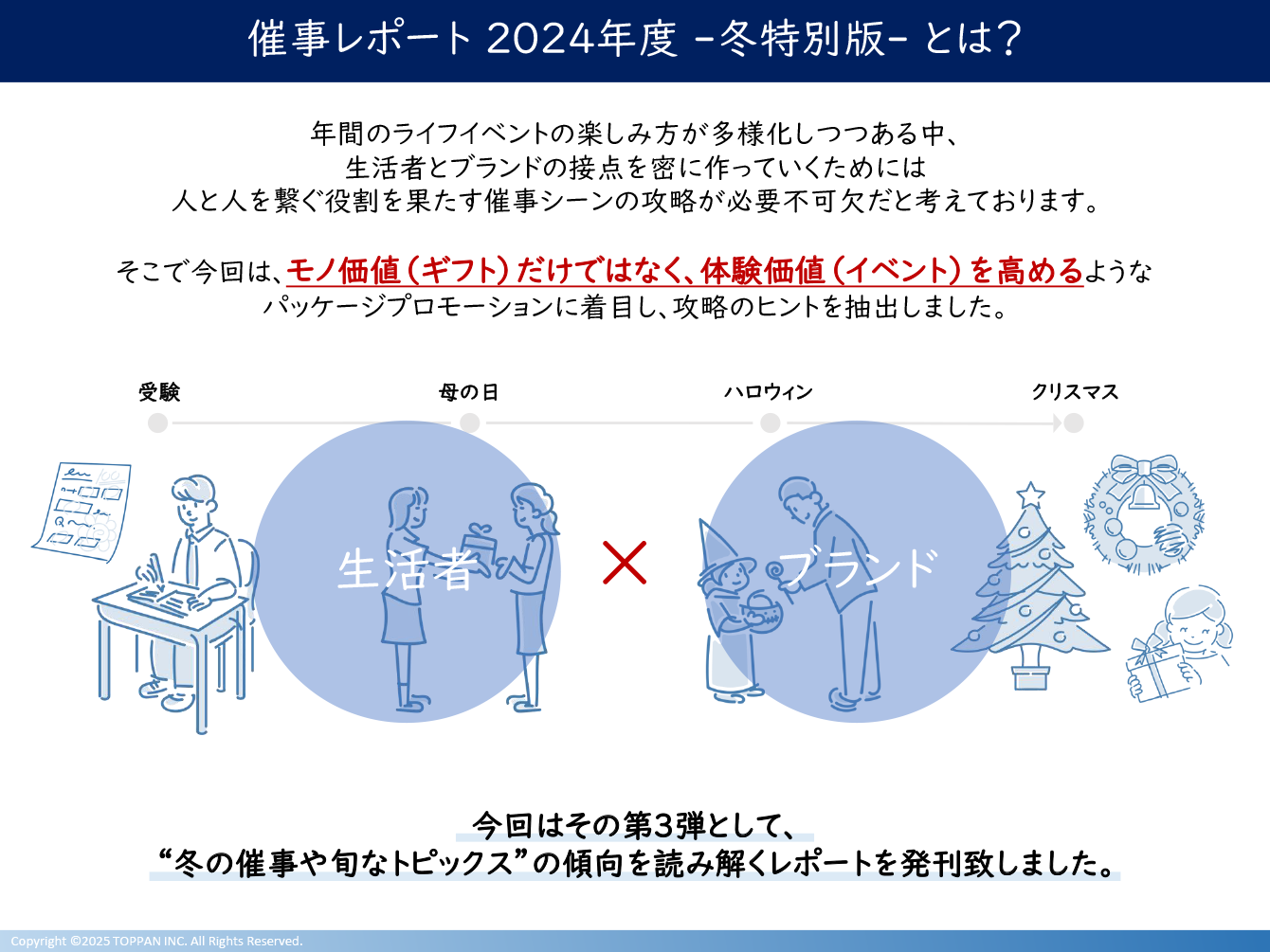 本レポートは2024年12月~2025年1月の旬な催事トピックスを対象に、生活者データから動向を振り返る「分析編」、動向・分析を裏付ける事例をピックアップした「ケーススタディ編」の2部で構成されています。