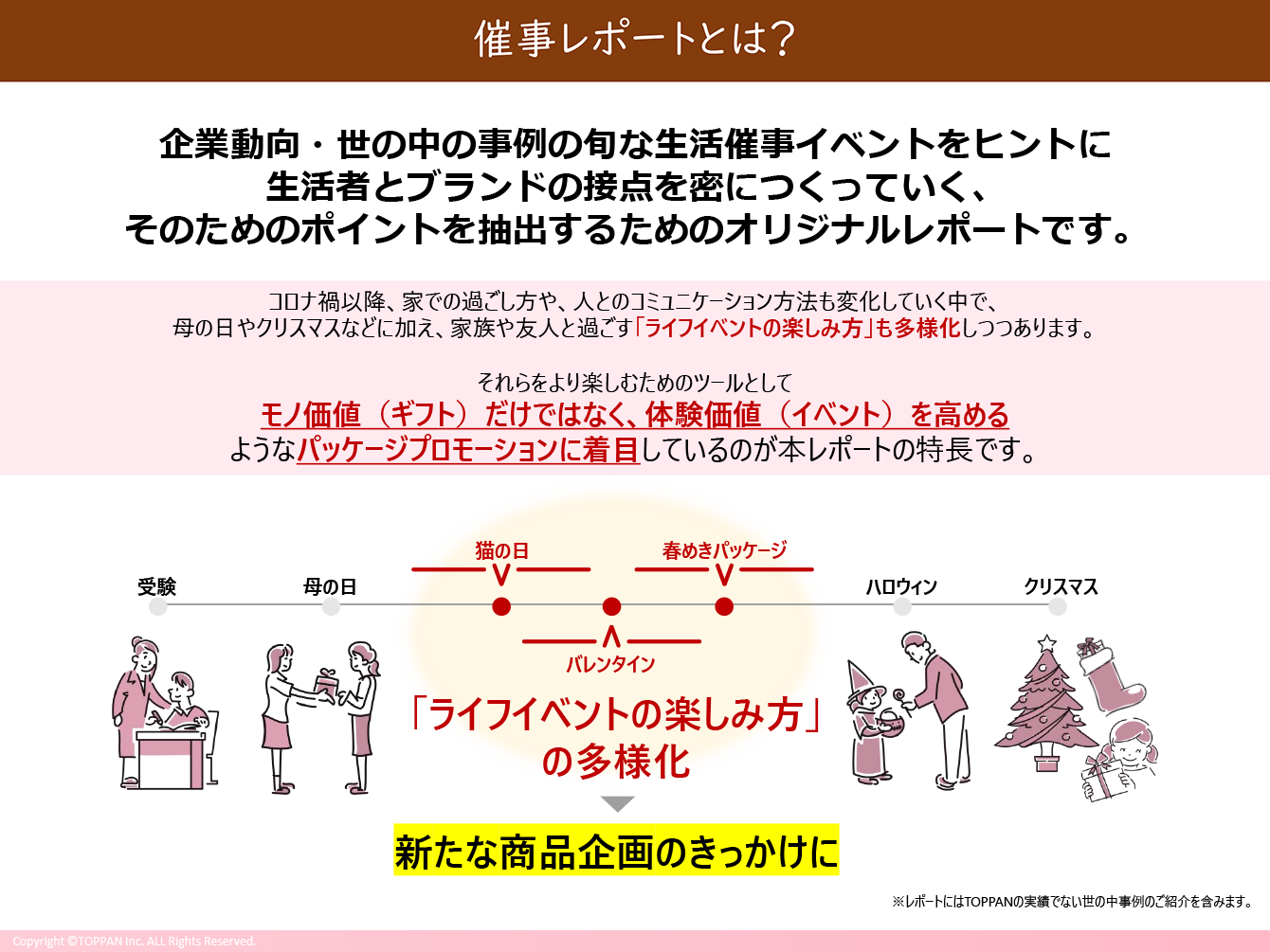 TOPPANでは、母の日や、バレンタイン、クリスマスなどの年間催事やシーズン毎の旬なトピックスの潮流・生活者実態に着目したレポートを制作し、発刊しています。