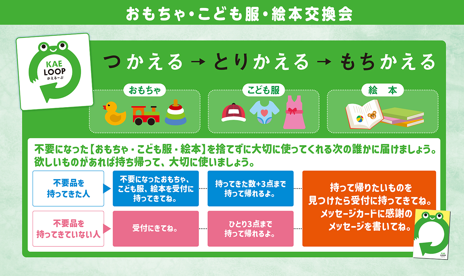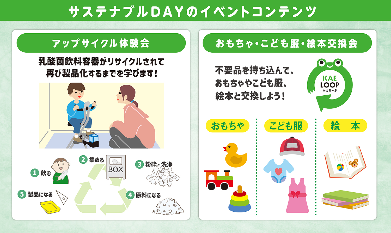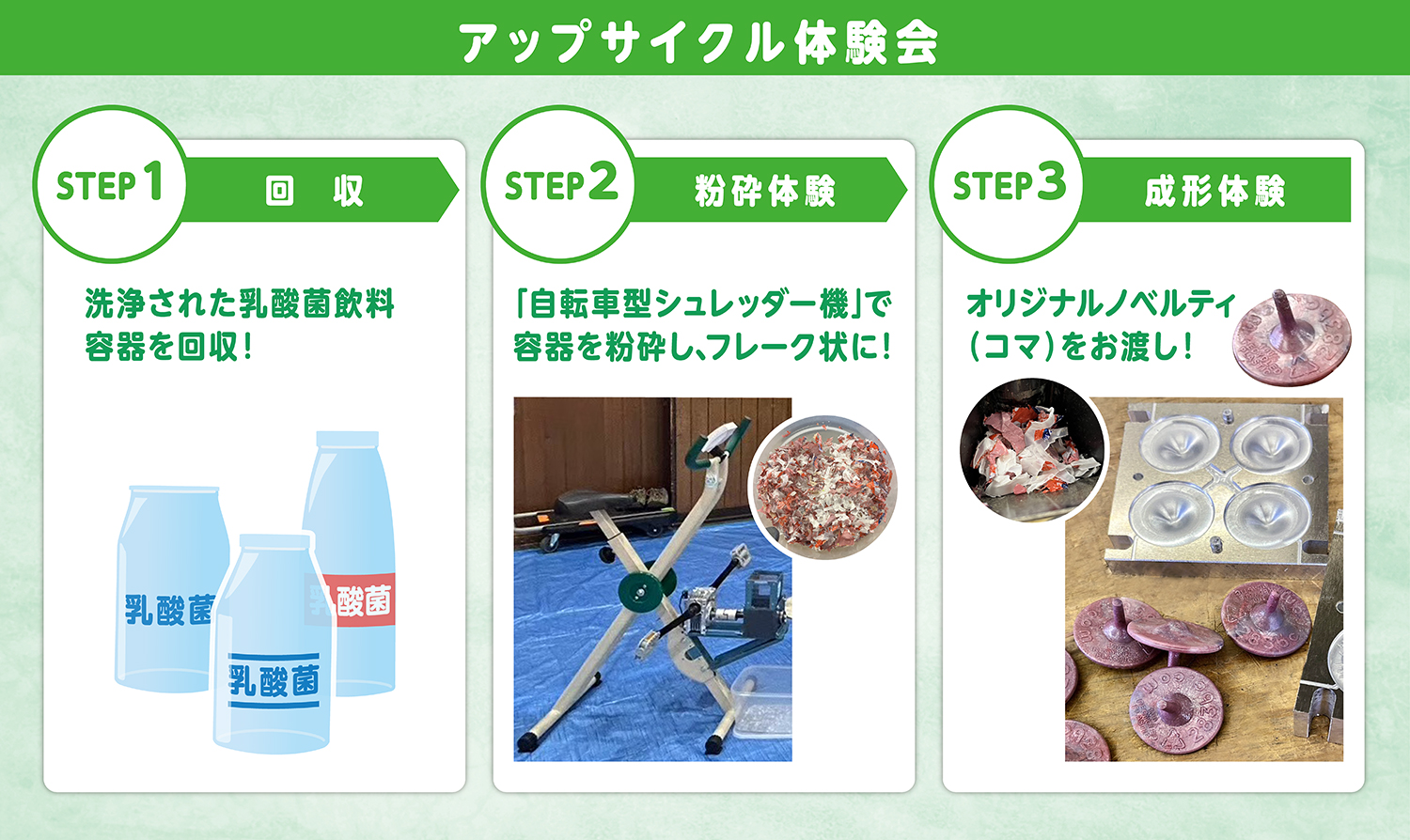 乳酸菌飲料容器が資源であることと、神戸市内で容器回収を実施していることの認知・理解促進を目的に、事前の広報施策からイベント運営までをTOPPANでディレクション。イベント内では、実際に参加者から使用済み容器を回収し自転車型シュレッダー機で破砕。さらに事前に用意した材料を用いて(フレーク化したヤクルト容器)、射出成型機でオリジナルコマづくりを実施。来場者に一連の容器の生まれ変わりを体験していただくことで乳酸菌飲料容器が資源であることを体感いただく狙い。さらにサステナブルコンテンツとして、おもちゃ・こども服・絵本を来場者同士で交換するコンテンツも実施し、会場を盛り上げた。