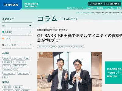 GL BARRIER+紙でホテルアメニティの歯磨き粉包装が“脱プラ” TOPPANのパッケージ関連の採用事例インタビュー。国際興業株式会社様にホテルアメニティの歯磨き粉包装の脱プラについて伺いました。 紙パッケージ サステナブル