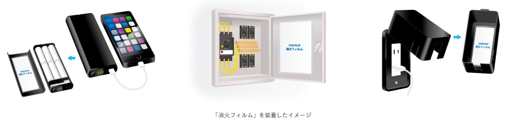 こうした発火リスクが増加していることを受け、TOPPANでは火災発生時の熱に反応し、消火効果のあるエアロゾルを放出する消火フィルム「FSfilm®」(Fire Propagation Suppressing Film®)を開発しました。